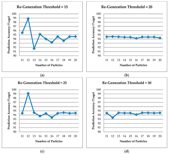 Figure 13 shows the results of prediction accuracy of energy consumption data with the re-generation thresholds 15, 20, 25 and 30 in Figure 13a–d respectively. The results are calculated for 100 iterations each. We observe that, at re-generation threshold 15, maximum accuracy is 98.87%. The accuracies for threshold 20 went down to around 94% while again rising at threshold 25. At 25, maximum accuracy is achieved of 99.13% while after 25 the accuracy again tends to decrease. Hence, from the comparisons, we could conclude that 25 iterations is a most suitable number for regenerating the particles’ positions for a quick search for an optimal solution.