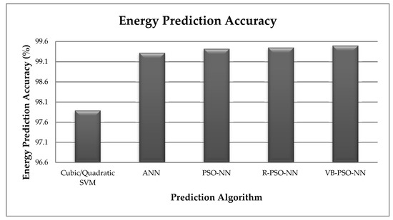 In order to validate our proposed model’s efficiency, we chose ANN [61] and SVM [62] for comparisons; as the literature review indicates ANNs and SVMs to be the most widely used algorithms in building energy consumption predictions [14,15]. In this work, we implemented a hybrid PSO-NN algorithm for building energy predictions and proposed two modifications in it for improving its performance. PSO-NN is an optimized version of ANN. The performance of PSO-NN will be better than ANN as PSO-NN optimizes the weights of ANN. Hence, the results achieved by our two proposed modifications of PSO-NN improve the prediction accuracy even more, outperforming the performance of ANNs (Table 1). For further comparisons, we run the SVM algorithm on our input data. We have used MATLAB R2018a (The MathWorks, Inc., Natick, MA, USA) for training our data on the SVM model. The implementation of SVM in MATLAB automatically scales data into range of [−1, +1], thus we do not need to pre-process data any further. We trained our data on six different kernels as linear, cubic, quadratic, fine Gaussian, medium Gaussian and coarse Gaussian SVM. The results with the quadratic kernel (97.89%) and cubic kernel (97.89%) were best in comparison to all six SVM implementations but still lower in comparison to ANN, PSO-NN and our proposed R-PSO-NN and VB-PSO-NN (Figure 16).