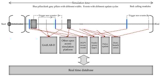 The system dynamics (SD) method is a well-accepted method for studying the long-term dynamics of a complex system. The uncertainties involved in the long-term timeframe are normally simulated by Monte Carlo simulation and stochastic programming. For example, the electricity demand-supply balance in the power system in China was studied using the SD method [22]. The effect of the current subsidy system on the development of PVs was previously reported [21,23], whereas the Monte Carlo simulation was used to cover the probabilistic feature in the risks of the development of PV technologies [23]. Our study aimed to simulate the effect of DGPV on the distribution system, which requires solving nonlinear functions. Along with the development of ADN, the variety and complexity of interactions between multiple entities will increase continuously; even the typical topology of the distribution network will change. Previous studies have not used abstract models in SD to address the abovementioned complexity. Open source simulation platforms for distribution systems have been developed, such as the GridLAB-DTM distribution system simulator [24,25]. By integrating a power system simulator into the SD method, the complexity of the evolution of the ADN can be fully captured. Therefore, in this paper, an event-driven co-simulation platform is proposed to study the evolution of ADN under a long-term timeframe. The main outlined of this platform is provided in Figure 1.