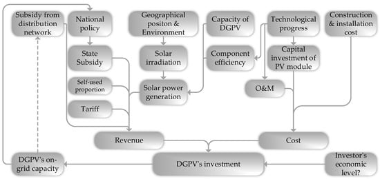 Figure 2 shows the factors that affect DGPV investment from the DGPV point of view. The willingness of investors to invest in DGPV is mainly decided by a DGPV project’s internal return rate (IRR). When the investment decreases or/and revenue increases, IRR increases. Then the DGPV investment willingness increases. The dashed line in Figure 2 denotes the distribution subsidy decided by the benefit that the distribution system obtains from the integration of DGPVs, which is analyzed by this study in the following sections.
