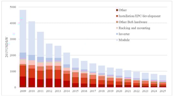 According to the statistics, the cost of DGPV has been decreasing and reached a level that makes the investment into DGPV economically feasible in some areas or countries even without subsidies, such as in Chile. Figure 3 displays the average global weighted total installed costs of utility-scale solar PV according to the historical data and expectation [30,31]. The decline in the total installed cost of DGPV will be slower without considering the scale economic effect. Another aspect that requires attention is the slowing down of the decreasing trend. Undoubtedly, the next round of motivation for investment will reside in the reforms of the subsidy and tariff systems and the increase in generation efficiency.
