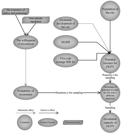 The decision to invest is mainly decided by a project’s economic feasibility, which is affected by a city’s economic development, per capita income, awareness of technology, policies, etc. These factors determine the potential investor’s willingness to invest in DGPV. Figure 4 shows the model we built to estimate the investment capacity into DGPVs with consideration of the main factors that affect the decision and capacity of the investment. The population of the city decides the volume of the potential investors. Among the potential investors, part of them are willing to invest in DGPV projects. This percentage is decided by the five-year-averaged IRR of DGPV projects, MARR, and the popularity of the generation technology. However, being willing does not mean that the potential investor will invest in the project. In this study, we used the probabilistic method to simulate the uncertainty due to the subjectivity of potential investors. We used binomial sampling to sample people with investment willingness to decide the number of investors and the capacity of projects.
