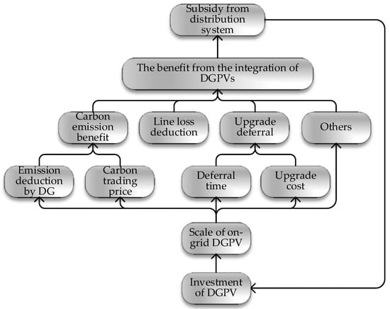 Based on the assumptions about DGPV coordinated operation and management, distribution network, and load, the integration of DGPV entails multiple benefits, including the mitigation of energy shortages, reduction of network losses, decrease the loading level of the equipment, and the deferral of investments in the construction of the distribution network. Figure 5 outlines the benefits from the DGPV integration into the distribution network. In this study, we consider carbon emission benefit, line loss reduction benefit, and upgrade deferral benefit as examples. The distribution subsidy provided to DGPV investors from the distribution system side originate from these three benefits.