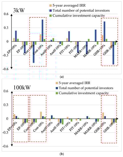 The sensitivity of the five-year averaged IRR, total number of potential DGPV investors, and cumulative investment capacity due to the changes in parameters are shown in Figure 6. The y-axis is the relative variation of the output of the control groups from the output of the standard case.