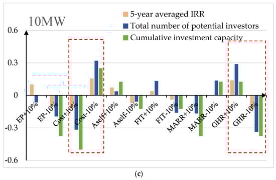 Standardized sensitivity analysis results. (a) 3 kW; (b) 100 kW; (c) 10 MW.