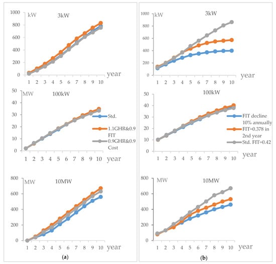 The simulation results are provided in Figure 7, showing that: (1) In areas with a 10% higher GHR, the FIT decline scheme does not cause significant decrease in the accumulative capacity of DGPVs. For the 3 kW and 100 kW categories, the DGPV on-grid capacity at the end of 10th year is even slightly more than of the standard case. (2) In area with a 10% lower GHR, when FIT remains at 0.42 CNY/kWh and capital investment decreases by 10%, the on-grid capacity at the end of the 10th year had no significant changes compared to the standard case. Specifically, 10 MW projects are not sensitive to the decline in the FIT subsidy, but sensitive to the decrease in capital investment. Therefore, in this case, even in lower GHR areas, the cumulative integration capacity outweighs the standard case. (3) By comparing the standard case, case 1, and case 2, without subsidies from other sources, the decrease in the FIT scheme affects the investment into 3 kW DGPV the most, followed by the 10 MW category. The investment into 100 kW is affected the least, because the economic infeasibility of 10 MW projects turns more investors to 100 kW projects.