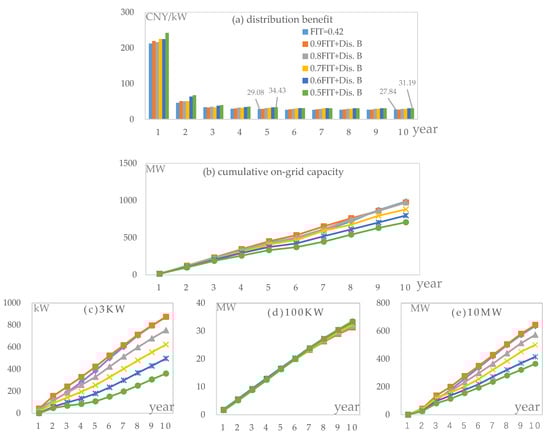 During the first simulation year, because the integration capacity is small and the deferral benefit is large, the integration benefit is relative large. As the integration capacity grows, the distribution benefit stabilizes, as shown in Figure 8a. Figure 8b shows that the distribution benefit can replace 20% of the FIT for the cumulative on-grid DGPV capacity (including all three different capacity categories) to reach the same on-grid integration scale as that of the base case with no distribution benefit and FIT = 0.42 CNY/kWh. Figure 8c–e show the increase in integration capacity of each capacity category in detail. With a distribution benefit, the on-grid capacity of the 3 kW and 10 MW DGPVs can reach the same level at the end of the 10th year when FIT is reduced by 10%. Even when FIT is reduced by 50%, with a distribution benefit, the on-grid capacity of the 100 kW DGPV still attains the same capacity.