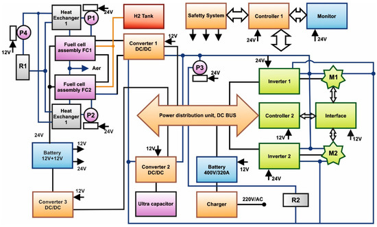 A hybrid system with three energy flows is built by connecting the three components of energy production and storage—the fuel cell, ultracapacitor, and battery [10,11,12,13]—to the same DC bus operating at constant voltage. The current distribution on the bus is dictated by the internal impedance of each component at any given time. The ultracapacitor, having the smallest impedance, discharges the fastest, and thus takes over in rapid transient regimes. The battery has a higher impedance than the ultracapacitor and supports higher currents for longer periods, which means it takes over in longer transient regimes, relative to the ultracapacitor. The fuel cell has the highest internal impedance and thus provides constant power to charge the ultracapacitor and batteries during periods of low energy consumption on the load. Two fuel cell assemblies (FC1 and FC2), with a net power of 33 kW each, are connected in series. To compensate for the technological dispersion, the two assemblies are independently controlled by hydrogen and an air regulator, whose flow rates are calculated according to the working parameters. The hydrogen supply is from two cylinders (H2 tank) with a capacity of 10 L and a pressure of 350 bar. Each fuel cell assembly contains an individual cooling system, which includes deionized water recirculation pumps (P1, P2, P4), heat exchangers (HE1, HE2), and a fan radiator (R1). The cooling system was designed to provide the optimum operating temperature (about 60 °C), irrespective of external environmental conditions.