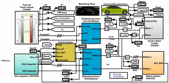 Figure 3 shows the complete simulation model of the drivetrain. The driving cycle was configured from the vehicle driving profile block, and the entire propulsion system was controlled and monitored by the Control System. All data were viewed on the monitoring panel. In the simulations, the input data of the energy management system were the current and voltage of the load, and the state of charge (SoC) of the battery. The output data were the control signals of each DC/DC converter. A snapshot of the simulated vehicle is shown in Figure 3.