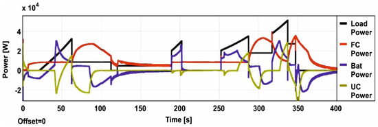 Power profile for the load (black) and the three system components—the fuel cell (FC, red); the battery (Bat, blue) and the ultracapacitor bank (UC, yellow)—on the DC Bus for coverage of power demand on the load for an acceleration cycle from rest to 100 km/h in 30 s.