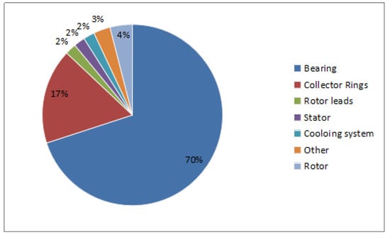 Whether it is a DFIG or PMSG, the generator power supply current always goes through the converter to the power grid. The switching device of the converter will produce a high-frequency common-mode voltage, which couples with the generator stray capacitance and induces a bearing voltage between the outer raceway and inner raceway of the bearing. If the bearing voltage exceeds the threshold voltage of the bearing lubricating oil film, which is located between the bearing ball and the raceway, the oil film will break down. This would result in the discharge of the bearing current and lead to bearing premature failure. Kevin Alewine, an expert at Shermco Industry in the United States, counted failure types of approximately 1200 wind turbines maintained by the company between 2005 and 2010. The failure rate of the bearings with power from 1 MW to 2 MW is 70% [], as shown in Figure 1. No matters on land or sea, wind turbines are installed on tall towers, and the maintenance and overhauling caused by bearing failures are complicated and expensive. Therefore, it is of great value to investigate the mechanism of bearing current and investigate mitigation methods.