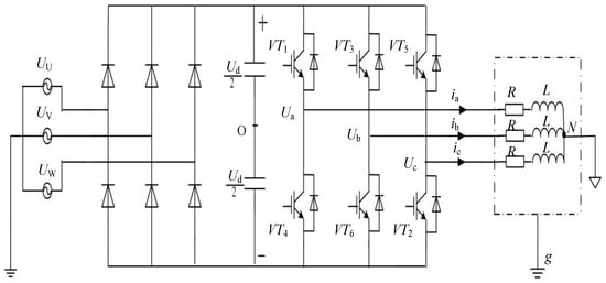 A two-level voltage converter is often applied to achieve DC/AC conversion in wind generation systems, as shown in Figure 3, where Ud is the DC link voltage. Switches VT1–VT6 are turned on/off by Pulse Width Modulation (PMW) waves, and the Digital Signal Processing (DSP) microcontroller are used to realize the SPWM strategy.