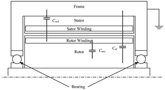 In DFIGs, there are four parts of the conductor, namely, the stator winding, rotor winding, rotor core, and stator core. The stator core connects to the frame and the rotor core connects to the shaft. Then, the stator core and frame are at the same electric potential, and the rotor core and shaft are also at the same potential. According to the partial capacitance theory of multi-conductor systems, the dielectric materials between the two conductors can induce stray capacitance. Therefore, there are three stray capacitances—Crwf, Crwr, and Crf—in DFIGs, where Crwf is the capacitance between the rotor winding and the frame, Crwr is the capacitance between the rotor winding and the rotor core, and Crf is the capacitance between the rotor core and the frame. The stator winding has no influence on other parts. The specific capacitance distribution in the DFIG is shown in Figure 5.