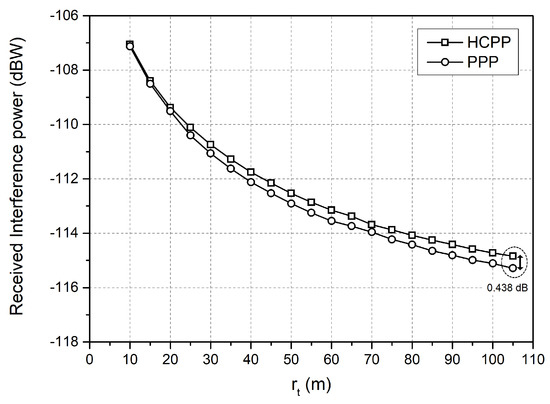 In [19], the tight bound of the received interference power is proposed by setting the UE’s position as the same with the tagged BS’s position. The interfering signals are generated at BSs farther than the thinning radius, and the results are obtained against thinning radius. The difference of the received interference power between HCPP and PPP is around 1–2 dB. Figure 2 shows the received interference power after the thinning operations in the HCPP and PPP. These results are the normalized interference power divided by the BS intensity. The square symbols represent the HCPP with the BS intensity (), and the circles indicate the PPP with the BS intensity ().