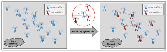 In summary, the BS to be awake and the BS to be in sleep mode can be determined through Algorithm 1, and the results are updated in . Namely, the updated indicates whether the BS should be awake or in sleep mode. Figure 3 shows the example of judicious BS control based on the proposed approximate thinning operation.