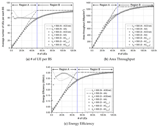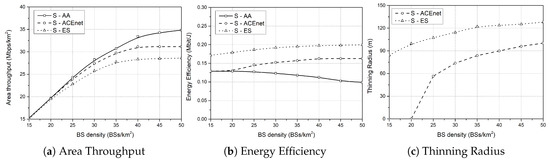 As shown in Figure 4a, the AA algorithm has the highest area throughput among these algorithms because the status of all BSs is maintained as awake. However, because the thinning operation is applied considering the number of active UE in the proposed ACEnet algorithm, the area throughput could not exceed the area throughput in the AA algorithm.