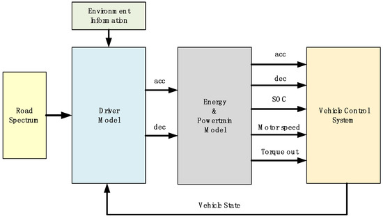 In this paper, the developed simulation model of the EDT, established in the Matlab/Simulink (R2016b) with state flow, consists of the environment information, road spectrum, energy and powertrain system, vehicle control system and driver system, which is a proportional-integral-derivative (PID) control model that allows for the reference velocity to be followed, as shown in Figure 1. The overall status information is collected by the vehicle control system, and the corresponding information is fed back to the driver model. Some of the basic parameters related to the EDT are shown in Table 1 [22].