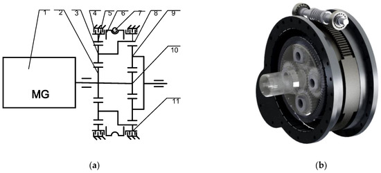 The layout of the transmission: (a) Schematic diagram; and (b) the designed transmission in SolidWorks ( MG, motor/generator; 1, drive motor; 2, 1st sun gear (S1); 3, 1st planet gear (C1); 4, 1st brake (B1); 5, 1st ring gear (R1); 6, worm shaft; 7, worm gear; 8, 2nd ring gear (R2); 9, 2nd planet gear (C2); 10, 2nd sun gear (S2); 11, 2nd brake (B2)).