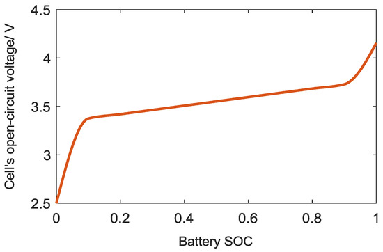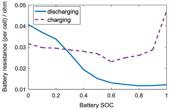 where stands for the battery terminal voltage, open-circuit voltage, instantaneous current and internal resistance, respectively. The relationship between the internal resistance and the state of charge (SOC) is shown in Figure 3, with the solid line presenting the discharging resistance and the dashed line presenting the charging resistance, assuming the temperature is constant during the working cycle; meanwhile, the tendency of the battery open-circuit voltage with SOC is presented in Figure 4. Additionally, the operating range of the battery SOC is limited from 0.3 to 1 according to the battery management strategy.