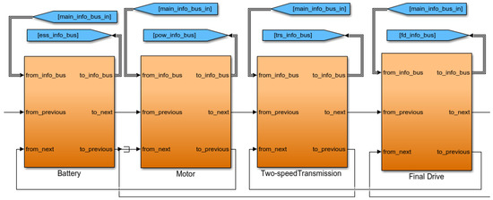 The mechanical powertrain model is the crucial part of the model, involving the energy storage unit, a permanent magnet synchronous motor (PMSM), the two-speed transmission and the final drive. Figure 5 describes the overall arrangement of the powertrain in simulink.
