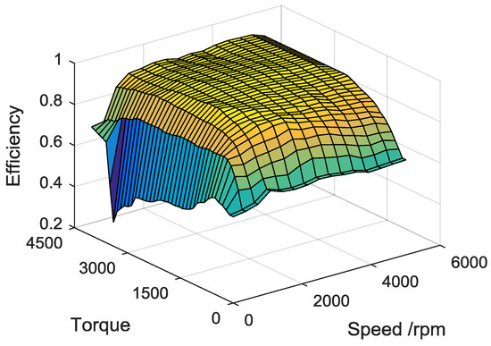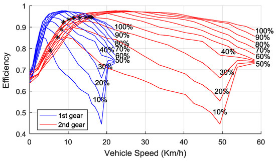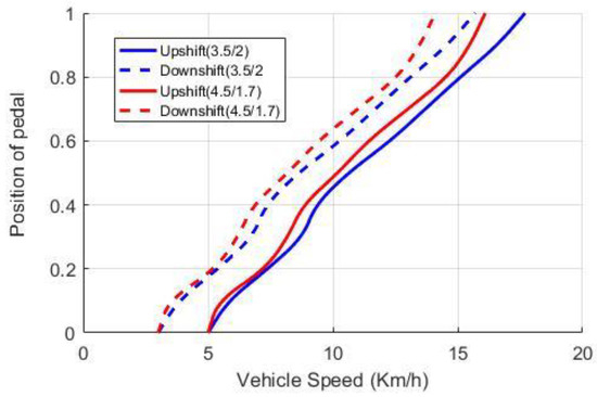 The shift schedule can influence the energy consumption to a degree. To achieve the energy conservation goal, the shift schedule basis of the economic performance, similar to the internal combustion vehicle shift schedule, is designed. The pedal position and motor speed are considered the shift parameters. Initially, the efficiency curves of each gear in different pedal positions are plotted according to the motor efficiency map. The motor efficiency map and efficiency curve are shown in Figure 6 and Figure 7, respectively. Following this, the intersection of the 1st gear curve and the 2nd gear curve is designed as the shifting point. The shift schedule changes with the change of gear ratio in the iteration to make the optimization results more accurate. Figure 8 shows two different shift schedules with different gear ratios. The red line presents the shift schedule under the ratios 4.5 and 1.7, while the blue one represents the ratios 3.5 and 2. As shown in the figure, the shift schedules are quite diverse due to different gear ratios. Moreover, to avoid shifting frequently, there is a speed interval between the upshift and downshift schedules.
