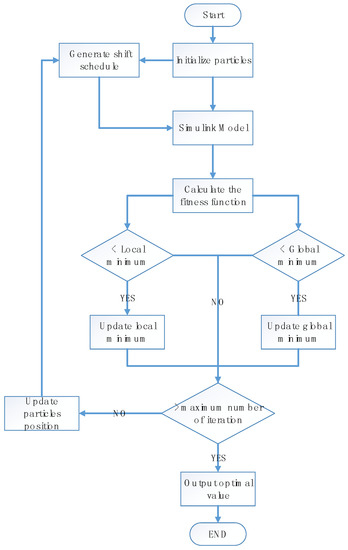 There are many algorithms for gear ratio optimization. Additionally, the common method is the enumeration algorithm, in which the global optimization result can be ensured. However, the accuracy of enumeration is limited to the step length and computing capability. In this paper, a gear ratio optimization algorithm is put forward based on the improved particle swarm optimization algorithm (PSO). The PSO algorithm is a kind of swarm intelligence optimization algorithm, in which the random particles generated by the initialization are iterated to search for the optimal solution. In each iteration, the particle location is updated by tracking the current local optimum and the global optimal solution. Additionally, the termination condition is generally set to achieve the maximum cycle number or to meet the minimum error condition [28,29]. To prevent the PSO algorithm from falling into the local optimal solution, a random variation factor is introduced to the algorithm. If it meets the trigger condition, the particle location generates a random offset. The flow of the PSO algorithm can be described in the following steps: