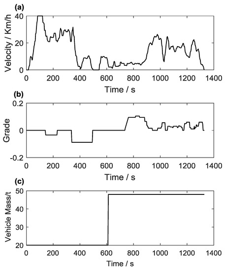 Driving cycle information: (a) velocity; (b) road grade; and (c) vehicle mass.