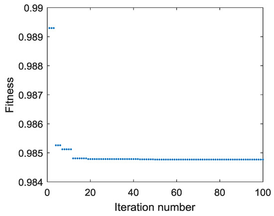 The improved PSO algorithm described above is used to determine the optimal values of the gear ratio. Setting the size of the population to 5 and the iteration number to 100, the fitness values generated during the iteration process are shown in Figure 13. The iteration result illustrates the optimal values of the gear ratio for certain driving conditions. The optimal ratio for first gear is 4.65, while for second gear it is 2.21.
