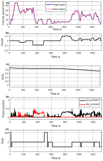 Simulation results: (a) velocity comparison; (b) road grade; (c) SOC curve; (d) pedal position of acceleration and brake; and (e) gear control sequence.