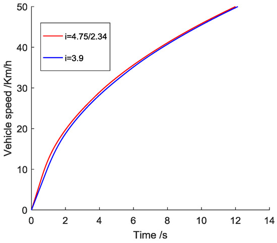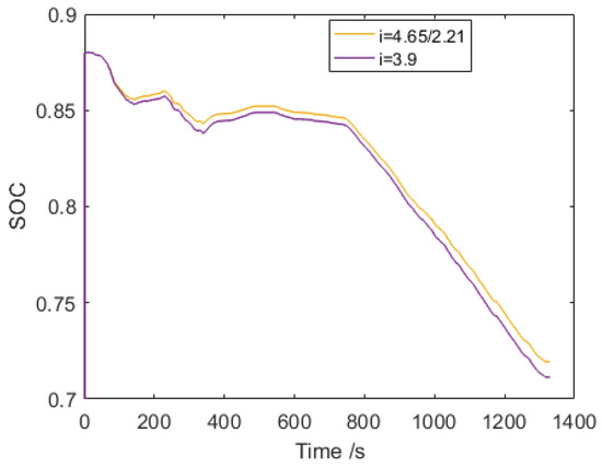 To verify the effect of the optimal ratio, the simulation results are compared with the battery electric dump truck equipped with a single gear transmission, , for both economic and dynamic performances. Figure 15 shows the comparison of the acceleration time from 0 to 50 km/h in full load condition. As shown, the acceleration ability increases when compared to EDT with a single speed transmission. The increment is related to the weighting coefficient of the objective function. The energy consumption comparison is shown in Figure 16. The initial value of SOC is 0.88 in the simulation, supposing that the energy recovery efficiency is 30%. The final values of SOC are 0.717 and 0.727, respectively, which means that the energy consumption has been reduced by 6.1% in relation to the application of the two-speed transmission. In combination with the velocity curve, we can see that between the two transmissions, there is little difference in the energy consumption in low speed operating areas. Meanwhile, the gap tends to be obvious after 80 s when the EDT speeds up to a high speed running state. Following this, the change of SOC tends to synchronize during 300 s to 700 s as the truck slows down. The disparity becomes further obvious as the truck accelerates after 700 s. Thus, the two-speed transmission improves the energy utilization efficiency in high speed operating areas, mainly because the overtop speed leads to lower motor efficiency.