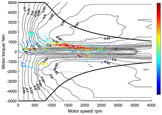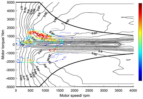 Figure 17 and Figure 18 show a more intuitive explanation of the reasons for the difference in energy consumption. Figure 17 reveals the operation point distribution on the motor efficiency map of the single-speed transmission. Figure 18 shows the distribution of the two-speed transmission. The red areas represent the most concentrated areas of the operating points while the blue represents the relatively sparse areas. Cooperating with the single-speed transmission, the motor operates in a large range of speed with most of the operating points distributed in the efficiency range of 80% to 92%. The distribution of the operating point with a two–speed transmission is more concentrative in comparison. Most of the points are located in the efficiency range of 92% to 95%. This is because the motor with a single-speed transmission needs a larger speed range to follow the required velocity during the cycle, while overlapping areas of the operating points can be found when the motor is equipped with the two-speed transmission which concentrated more operation points within the high-efficiency area of the motor map. This means that the motor efficiency is not necessarily sacrificed to achieve high speed. It should also be noted that the overall efficiency of the driving system has been improved.