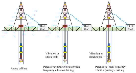 The lower rate of penetration (ROP) is one of the key technical difficulties during drilling of shale reservoirs. The low ROP increases the drilling time and cost. The drill string will produce complex vibrations and shock to the bit, then the rock-bit interaction load is dynamic. In order to increase the ROP, several typical drilling technologies were proposed, such as rotary drilling, percussive drilling and percussive-rotary drilling (PRD) (Figure 1). However, the rock fragmentation under dynamic loads was not clarified [1,2]. There are lots of studies concerning rock dynamic fragmentation mechanisms. One of the earliest reports of percussion drilling technique occurred in 1940s [3]. Since then different terms have been used, such as downhole hammer, percussion hammer, down-the-hole hammer, percussive drilling, and PRD [4,5]. PRD is developed from rotary drilling and percussive drilling. Significant results in understanding the percussive fragmentation mechanism have also been achieved in the laboratory. The rock fragmentation efficiency is not a linear relationship with the drilling parameters, such as weight on bit (WOB), torque on bit (TOB), and rotations per minute (RPM). Experiments examining rock breakage under dynamic and static loads were carried out. PRD is one of the best ways to improve the drilling efficiency of hard formation. The fragmentation investigation of granite is studied by the use of the dynamic and static rock-breaking test device, reasonable load of single cutter cutting rock under the impact-static action was proposed [6,7,8].