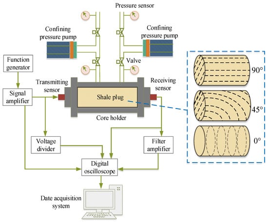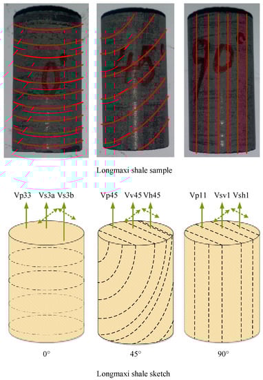 To evaluate the dynamic process of rock damage in shale gas reservoirs, the rock elastic mechanical properties were measured. Shales have anisotropic characteristics and are typically considered to be symmetric with a symmetry axis perpendicular to the bedding. When evaluated from elastic wave velocity measurements, this tensor characterizes the dynamic apparent behavior of the material. Multi-core methods have been used to study anisotropy [27]. Five independent constants may be related uniquely to the five classical engineering elastic constants of a transversely isotropic medium [28]: