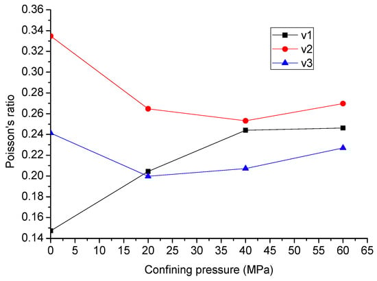 Figure 6 indicates the dynamic Poisson’s ratio of the LMX shale under confining pressure between 0 and 60 MPa. When compressed in a direction perpendicular to the axis of symmetry, is the dynamic Poisson’s ratio obtained by dividing the strain perpendicular to the direction of compression in the plane of isotropy by the strain parallel to the direction of compression. is the dynamic Poisson’s ratio obtained by dividing the strain parallel to the axis of symmetry by the strain parallel to the direction of compression. is the dynamic Poisson’s ratio obtained by dividing the strain perpendicular to the axis of symmetry by the strain parallel to the axis of symmetry when compared in a direction parallel to the axis of symmetry [27,28]. When the confining pressure is in the range of 0–40 MPa, the Poisson’s ratio and decrease gradually, but the Poisson’s ratio increases.