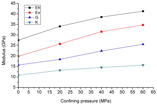 Figure 7 shows the dynamic modulus of the LMX shale under hydrostatic loading between 0 and 60 MPa. The dynamic modulus (, , , )increases with the increasing of the confining pressure. The Young’s modulus is lower than .