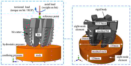 In order to facilitate the establishment and calculation of the numerical model, the following assumptions are made: the rock internal pore pressure, temperature, and the bottom hole flow field are ignored, but the hydrostatic pressure is considered; repeated fragmentation of cuttings is neglected, and if rock failure occurs, an element is removed from the mesh; The full-scale PDC bit is simplified as a rigid body. Numerical simulation of PRD is investigated by using ABAQUS, as presented in Figure 8; the bit and rock have the same Y-symmetrical axis. The full-scale PDC bit consists of 6 blades on which the cutters are mounted. Bit diameter is 215.9 mm, bit cutter diameter is 16 mm, and the diameter and height of the cylindrical rock sample are set to be 330 mm and 120 mm, respectively. Both the rock and bit were meshed using eight-node hexahedral linear reduced integration elements, among which an hourglass control was considered. The mesh resolution was optimized with respect to the computing resources available. Because of the strong nonlinear of the numerical model, the implicit algorithm was used to calculate the stress field caused by the confining pressure and hydrostatic pressure, the explicit algorithm was used to analyze the bit-rock interaction [31].