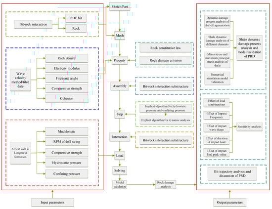 The modelling progress of PRD with a full-scale PDC bit was as shown in Figure 9, which illustrates the relationship of input parameters and output parameters in the numerical model of PRD. At the same time, the rock constitutive law, rock damage criterion and mechanical parameters were reflected in the model property part. The bit-rock interaction was reflected in the model assembly and interaction part.
