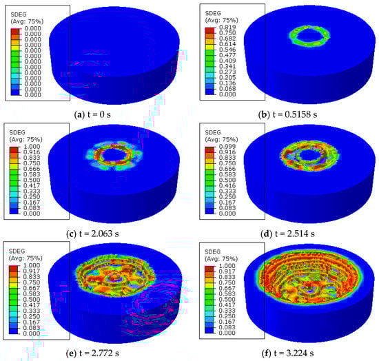 In the 3D numerical simulation model of PRD, an element is removed from the mesh if the damage variable D reaches 0.99. Figure 10 shows the contour plot of the rock damage variable with different drilling times. Figure 10a shows the bit-rock initiation point of PRD. When t = 0 s, the bit isn’t subjected to WOB and TOB, and the rock was in the in-situ condition, therefore, the damage of shale elements did not occur. Figure 10b,c show the bit contacted with shale elements, where the rock produced a certain amount of deformation in the contact elements, but the damage variable D has not reached the threshold of rock element damage failure; therefore, the bit did not break the rock. However, rock element damage failure occurs with the increasing of impact load and static load, as shown in Figure 10d, then immediately separate from the rock mass, the bit has drilled the rock surface. By that same manner, the bit peels off the second layer of shale. The whole process of shale breaking is finished, as show in Figure 10e,f. The numerical simulation of shale dynamic damage can show the entire rock fragmentation process for any drilling condition and provides a basis and system for the design of PRD without complex experimental instruments and field tests, which can reduce the experiment and test costs dramatically [15,26].