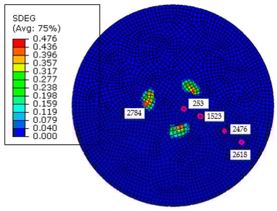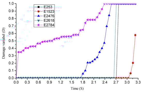 To analyze the damage sensitivity of the rock elements at different positions, five rock elements were set at the same height but with different radii, as shown in Figure 11. The damage of E2784 occurs earliest, as shown in Figure 12, where the damage variable increased quickly from 0 to 0.05 s, reaching its maximum value of 1 at 2.3 s, but the entire damage process is slow and has fluctuations. The damage of E2476 begins to happen at 1.7 s, reaching its maximum value at 2.5 s; the damage rate of E2476 is faster than E2784. When t = 2.7 s, E2618 and E253 began to experience damage almost at the same time, and failure occurs quickly at 2.75 s. Compared with E2784 and E2476, the damage variables of E2618 and E253 have no fluctuations. Element failure occurs only when the damage variable reaches the value D = 0.99, therefore E1523 is damaged at 3.05 s, but element failure does not occur. When different rock elements have the same drilling and formation conditions, with increasing distance from the element to the rock center, the fluctuations’ amplitudes of rock element damage at first increase and later decrease gradually in PRD. The results show that the rock elements of the bit center produce vibration to the bit, which increases the friction and wear of the bit; however, the rock elements of the bit edge produce shock to the bit, which increases the fracture probability of the bit cutters. This phenomenon is similar to the failure of a drill bit in field drilling conditions. The research results are important to the design and optimization of the drill bit.