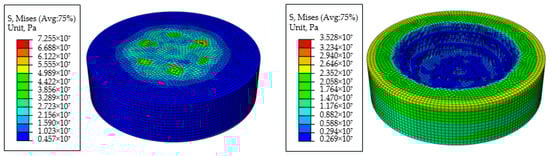 Mises stress contour of shale (left: t = 1.741 s; right: t = 3.059 s).