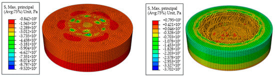 The contours of shale Mises stress and maximum principal stress for different drilling times are shown in Figure 13 and Figure 14, respectively. With increasing distance from the rock center to the sides, the maximum principal stress of shale decreases quickly, but the Mises stress of shale increases gradually. However, the rock’s Mises stress is greater than rock’s maximum principal stress at the bottom, and rock failure occurs along the direction of maximum principal stress. The pit has tensile stress, shear stress and compressive stress; shale fragmentation mainly depends on tensile and shear stress in PRD, followed by the compressive stress [15,18,19,20]. The results can be a suggestion to the drilling parameters’ optimization.