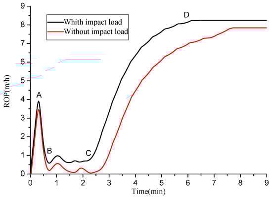 The simulation results of ROP under PRD and rotary drilling without impact loads.