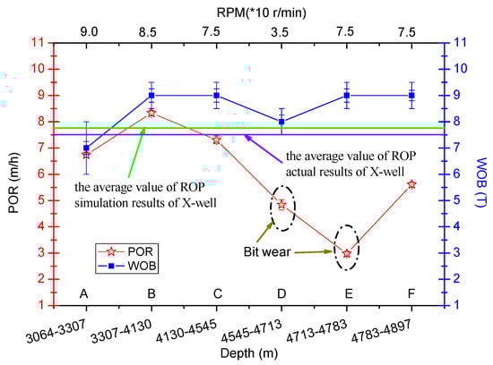 The horizontal length of X-well is more than 1000 m, and the cutters fracture and drill bit wear occurs in the D and E sections (4545~4783 m), so we only considered the A, B, C and F Sections, as show in Figure 16. The WOB fluctuation mean of A, B, C and F Sections is 8t, the volatility error is 0.25~0.5 t, RMP is 80 r/min, the average value of actual ROP is 7.5 m/h. At the same block and the same vertical depth, the ROP statistical results (7.5 m/h) of shale are relatively close to the simulation results (7.7 m/h), as shown in Figure 15, which verified the numerical simulation model.