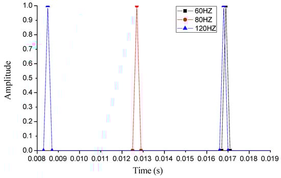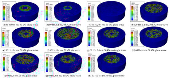 Figure 18 shows different impact frequency signals, and the damage variable of E2534 under different impact frequencies is presented in Figure 19. The rock damage efficiency under load frequency f = 120 Hz is higher than f = 80 Hz and f = 60 Hz. Rock failure is a damage-cumulative process. If damage cumulatively reaches the critical crack value, the rock elements will peel off from the rock mass. When the impact load has the same peak value, the rock elements contacting with the cutters obtain more energy with the increasing load frequency; this finding suggests that high impact frequency may be used to increase the ROP. However, rock fragmentation efficiency does not grow linearly with load frequency. The impact frequency is limited by the life of PRD tools, and the life of PRD tools is expected to decrease. Considering both the ROP and the life of PRD tools, too high an impact frequency is not suitable for use in PRD.