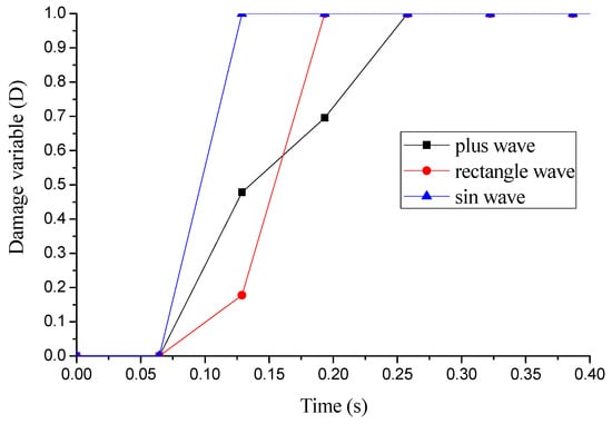 Figure 20 shows different impact wave shapes of PRD. Damage variable of E2534 under different impact wave shapes is presented in Figure 21. Shale begins to produce damage at the same time under different impact load wave forms, which has a great influence on ROP. The shale crushing efficiency under a sine shape is higher than rectangular wave or pulse wave. When the value of coupled impact-static load exceeds the rock damage critical value, the envelope area of the shock wave shape is the key factor that influences the breaking efficiency. A sine wave is a type of continuous wave; therefore, the sine wave shape and coupled dynamic-static load always has effect on the entire shale element damage process. Comparing rectangular wave and pulse wave, shale damage efficiency under a rectangular wave is superior to a pulse wave because the effective time of a rectangular wave is longer. The results indicate that the sine wave form should be used to the design of PRD tools [5].