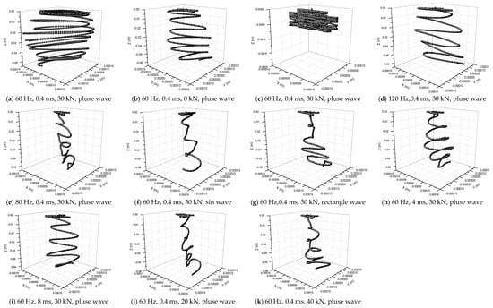 The movement trajectory of the drill bit is quite different in PRD. Some important laws were found. In comprehensive contrast analysis of Figure 26 and Figure 27, when the impact frequency is 60 Hz, impact is 0.4 ms, the peak value of impact force is 30 kN, and impact wave is sine wave, the ROP is at a maximum value, as show in Figure 26f and Figure 27f. The minimum ROP is show in Figure 26c and Figure 27c. Moreover, the higher the lateral vibration amplitude, the lower the efficiency of rock fragmentation [22]. Repeated instances of drill bit axial vibration for one indentation point will reduce the ROP. This law explains the reason that the lateral and axial random vibration of drill string or drill bit will reduce the ROP.