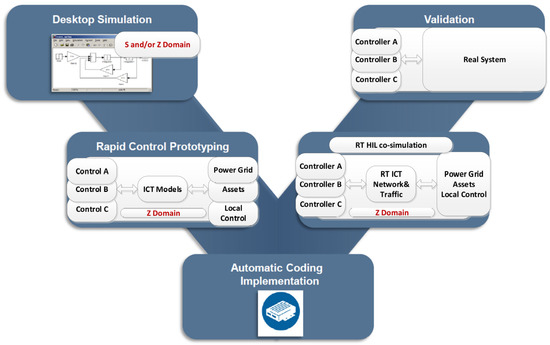 In this stage, the entire model is implemented in discrete domain with the proper sampling time for various subsystems. This model is implemented in a RT discrete simulator, e.g., Opal-RT. The control algorithms are tested intensively under various operating conditions to identify the robustness of the design. Based on the executed tests and their results, iterations of the control design and tuning may be necessary. It is worth mentioning that information exchange between different subsystems, i.e., plant controller, aggregator, assets, etc., is also captured at this stage with a dedicated model that is able to simulate the communication networks and their traffic (see Section 4). By using dedicated communication models for information exchange, it can be identified if specific ICT can meet the requirements imposed by control response. Moreover, this helps to specify minimum requirements (or boundaries) for ICT to provide a specific control function. This will allow the selection of the ICT for the deployment. Finally, the control is ready for implementation on the target hardware when the control design verification is finalized.