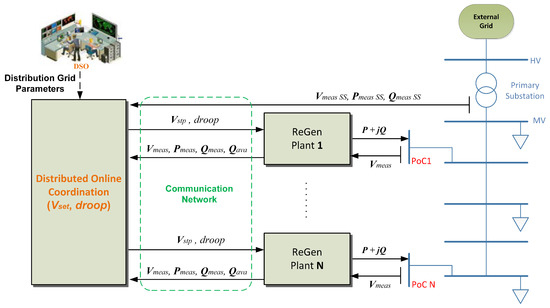 According to the Grid Code requirements, the voltage profile in a power system should remain within the desired tolerance band. For instance, in MV distribution grids, the voltage should remain within of its nominal value [16]. This challenge has to be fulfilled by each generation unit connected to the power system. The violation of this limit at certain points within the grid may possibly lead to severe stability problems and damage to the entire power system [6]. Although each ReGen plant can contribute to voltage regulation, as ascertained in [7,16], there can be additional control objectives required by the DSO, for example to reduce the grid power losses caused by reactive power provision. This objective can be accomplished by optimizing the control settings in the distributed online coordination scheme, as defined in [16], which constitutes an NCS of the SG developed on top of a communication network. The basic NCS architecture for distributed online voltage coordination is given in Figure 2.
