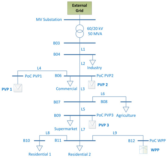 The BDG represents a typical radial feeder topology with primary substation ( kV) as shown in Figure 4, where the ReGen plants are shown as WPP, PVP 1, PVP 2 and PVP 3 (the BDG model is presented in detail in [16]). Based on the control architecture shown in Figure 3, this BDG is used to analyze voltage control in time domain for a volatile power profile of the ReGen plants, used as a benchmark test scenario that covers the crucial operating points with high solar irradiation and high wind speed (for details, see [16]).