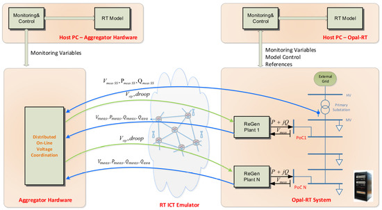 The online coordination between ReGen plants and the aggregator highly relies on the underlying ICT infrastructure. This imposes huge responsibility on ICT to make sure that the connection is reliable and meet other requirements for the said purpose. At this stage, implementing a dedicated fiber optics connection to all ReGen plants in the grid seems the best possible option. However, using fiber optic communication in this case will be a highly expensive option considering the huge penetration of ReGen plants in the distribution grids. There are a number of other options too, as detailed in [31,32,33], but the authors propose to use an existing ICT infrastructure that could offer low operating costs, faster deployment, high speeds and flexibility along with the provision of full expertise and manning to operate the network. For instance, cellular networks (with technologies such as Universal Mobile Telecommunications System (UMTS), Third-Generation Cell-Phone Technology (3G), Fourth-Generation Cell-Phone Technology (4G), Long Term Evolution (LTE), etc.) are already extensively deployed by the telecom operators throughout Europe with high coverage [34]. Therefore, in their previous work [7], the authors demonstrated (via offline simulations) on the use of the existing cellular network communication infrastructure and showed how it effects the provision of online voltage control and coordination functionalities from ReGen plants in distributed grids. Through non-RT simulation results, it is shown in [7] that, under normal network conditions, the cellular networks support the proposed online voltage control and coordination functionalities for ReGen plants in distribution grids.